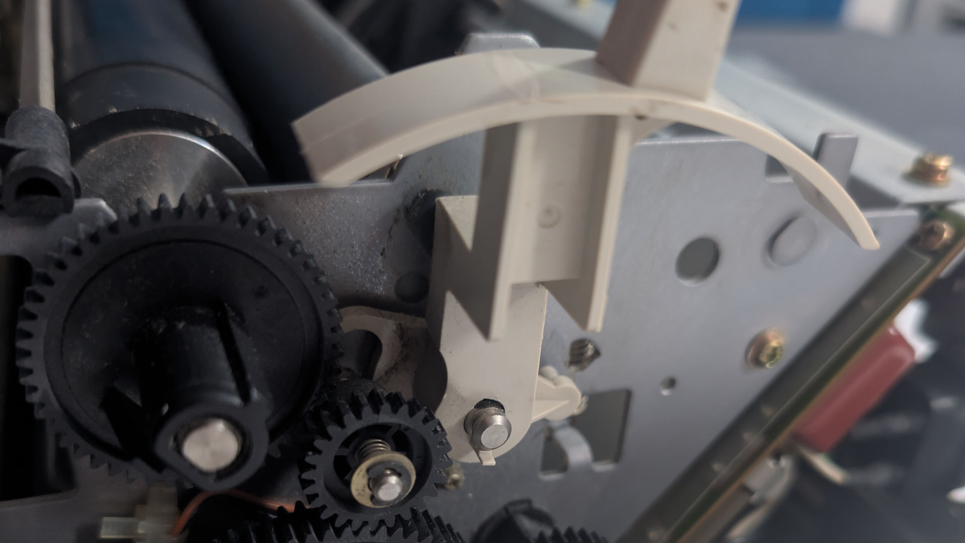 First thing is first, on the right-side of the printer we clearly have a broken clutch assembly, which is responcible in moving the flywheel gear from the manual feed mode to continuous feed mode. These things break naturally WITHOUT smashing them to the ground. When it's held in by two tiny tabs. What the hell, Okidata? Seriously. Without the tabs securly on the shaft. This plastic is one step away from shattering to bits.