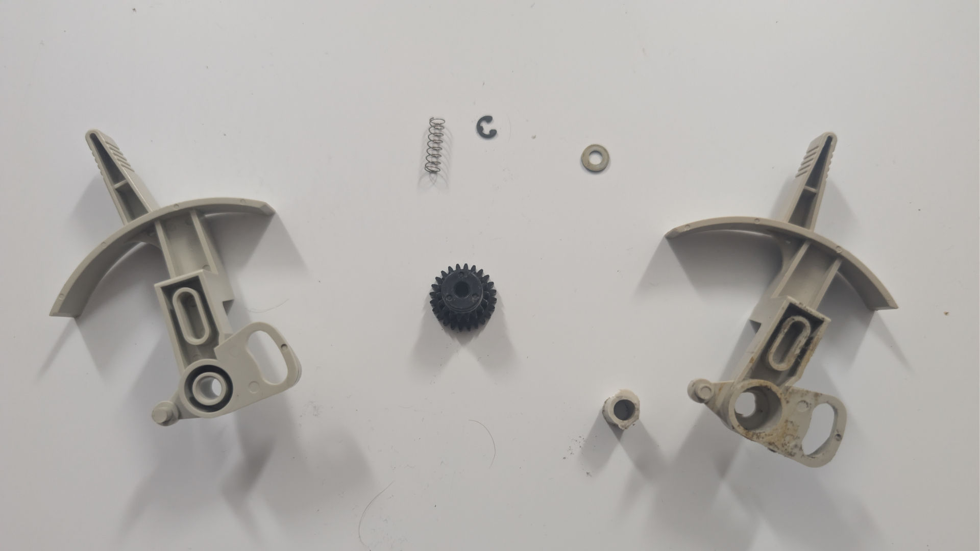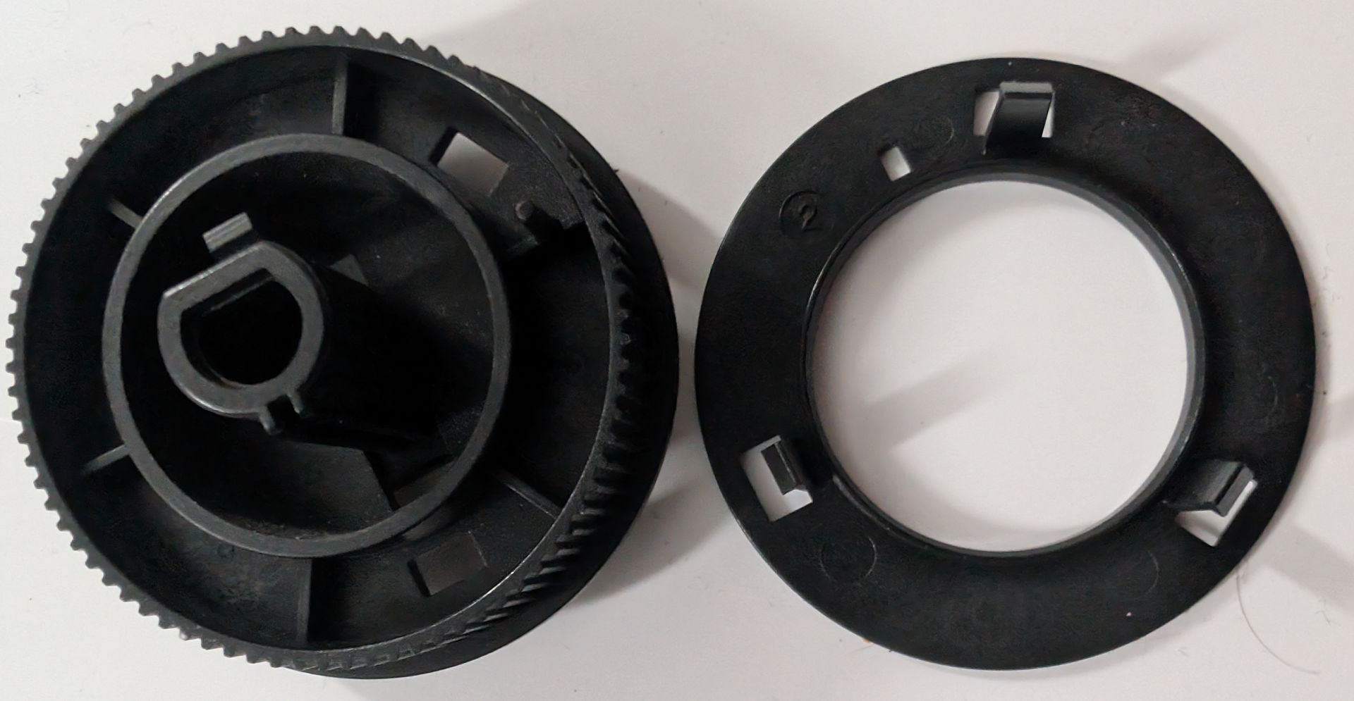 Good clutch from Llama on the right, Broken one on the left. Not only were the tabs broken, but the core was broken out of it as well. Which explains why we only had to remove the c-clip on one gear instead of the usual two. This is one of those parts that deserves to be re-engineered on a 3d printer using carbon fibre filament so it never breaks apart again.