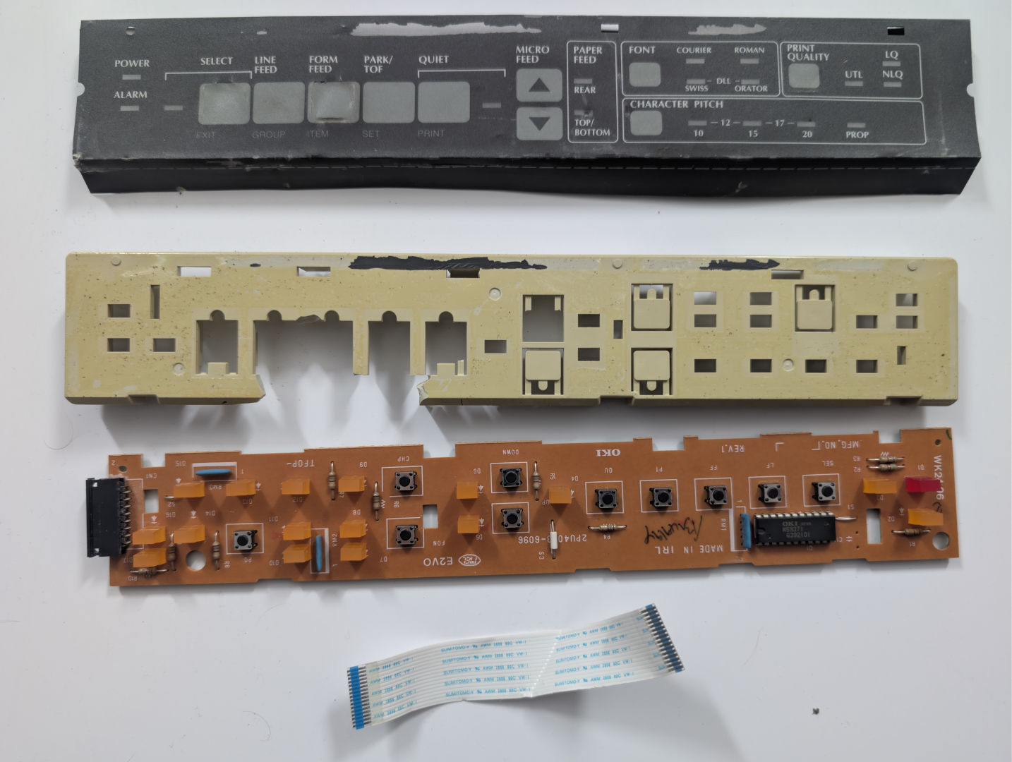 Llama pulled through once again on this one with his 393 control panel, which is virtually identical to the 395. The only thing it didn't have was the ribbon cable. As you can see on the good plastics, the two screw tabs on the top were totally obliterated from the original one. Also, the plastics were designed a little differently, where they didn't use a glue that destroyed the paint as they did on the Okidata 395. A bit of a quality loss between old 393 and new 395.