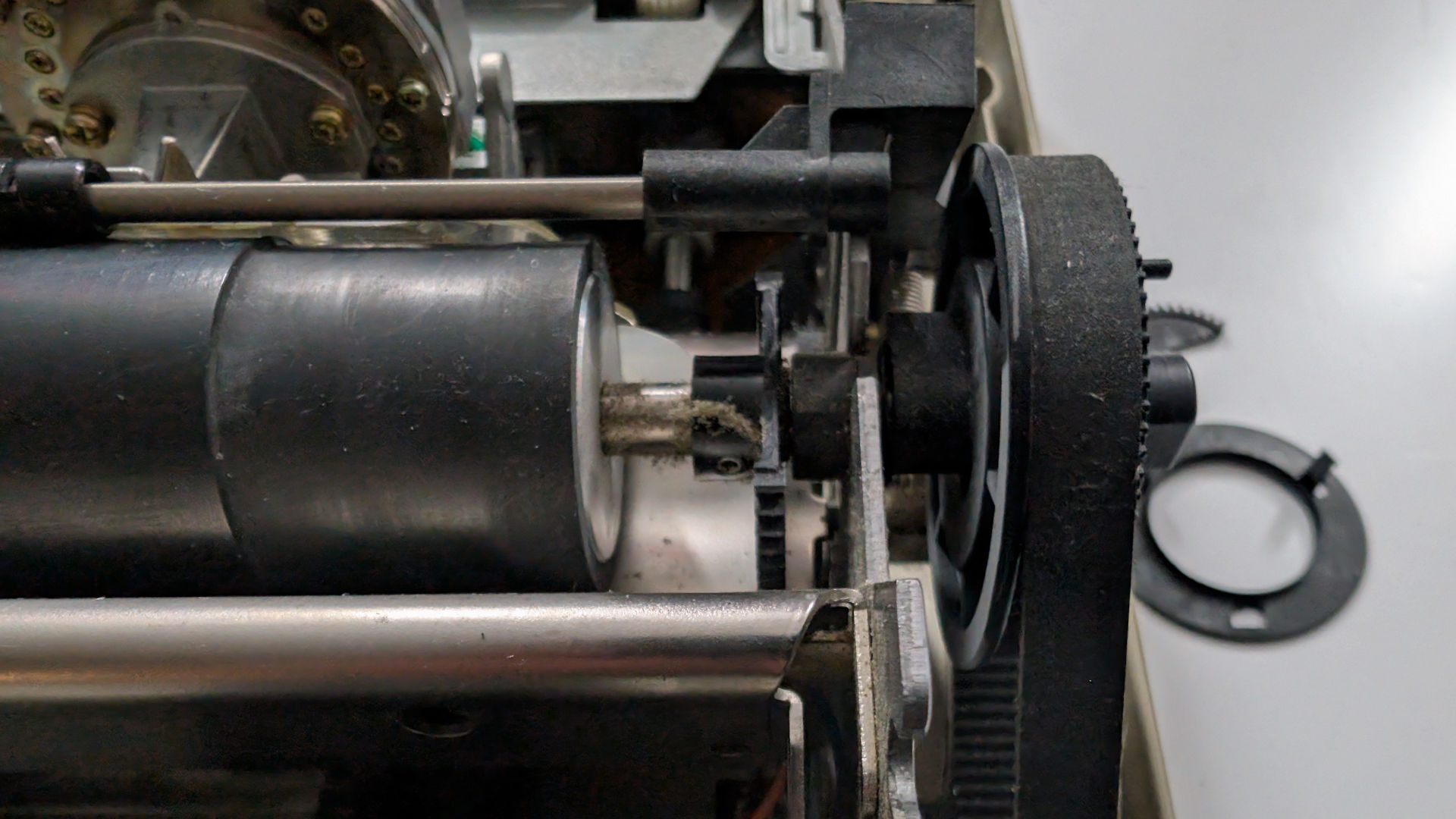 Flipping the printer 180 degrees, we look at the drive belt going from the stepper motor up to the primary pressure roller that makes contact with the paper. We have two problems going on in this picture.