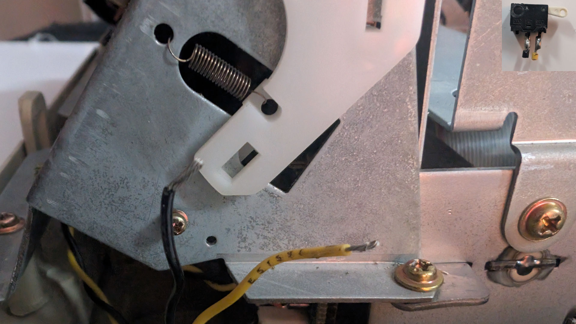 Moving to the front right-hand side of the printer, we encounter a safety feature, Okidata installed, which can also mislead users into thinking their printer is totally dead! There's this tiny cover-open switch that breaks incredibly easily! As you can see in the picture of the switch in the upper-right corner, our switch is in the down position. Which is completely wrong. There should be a switch that lifts when the white plastic is away from it.