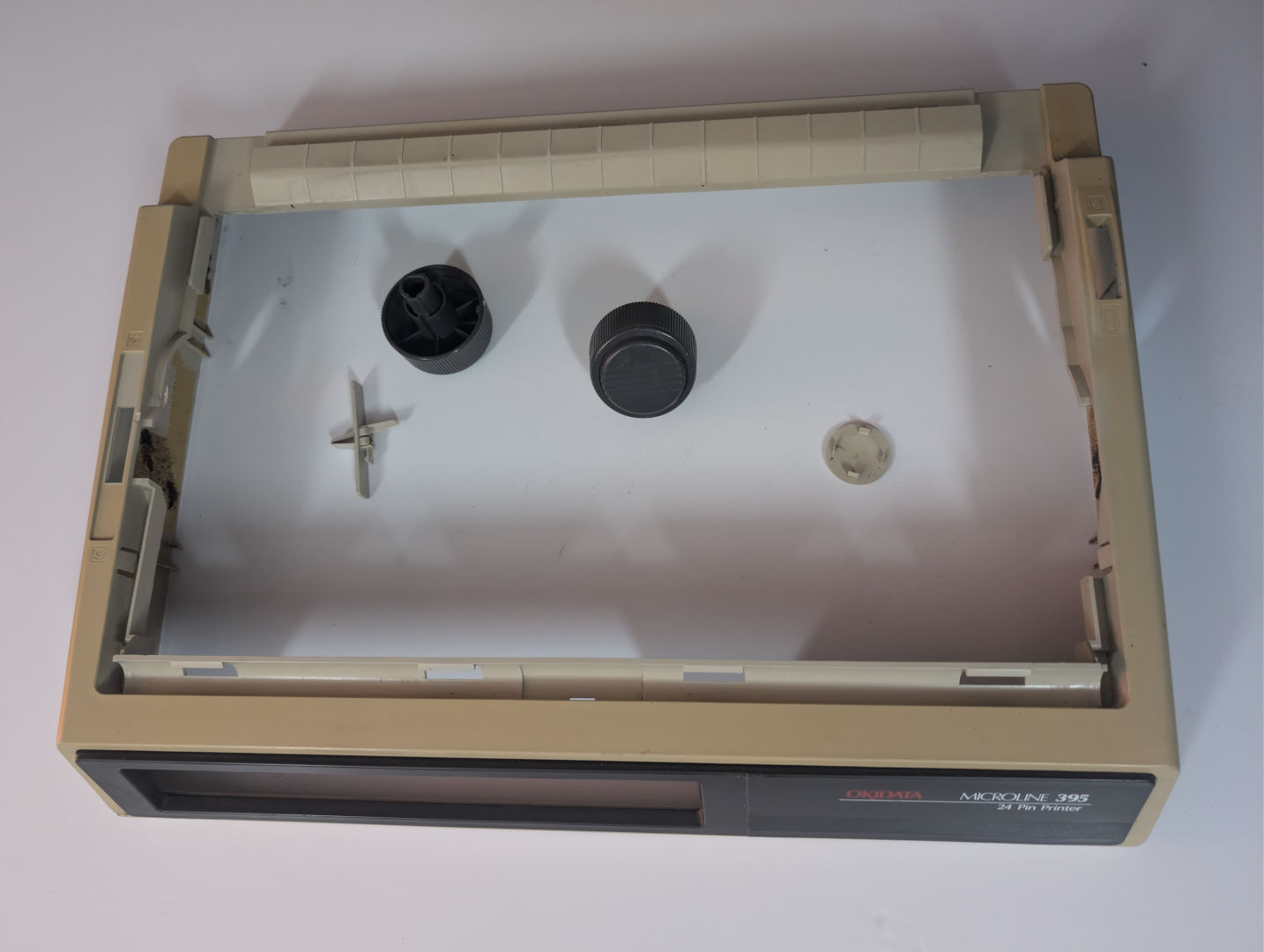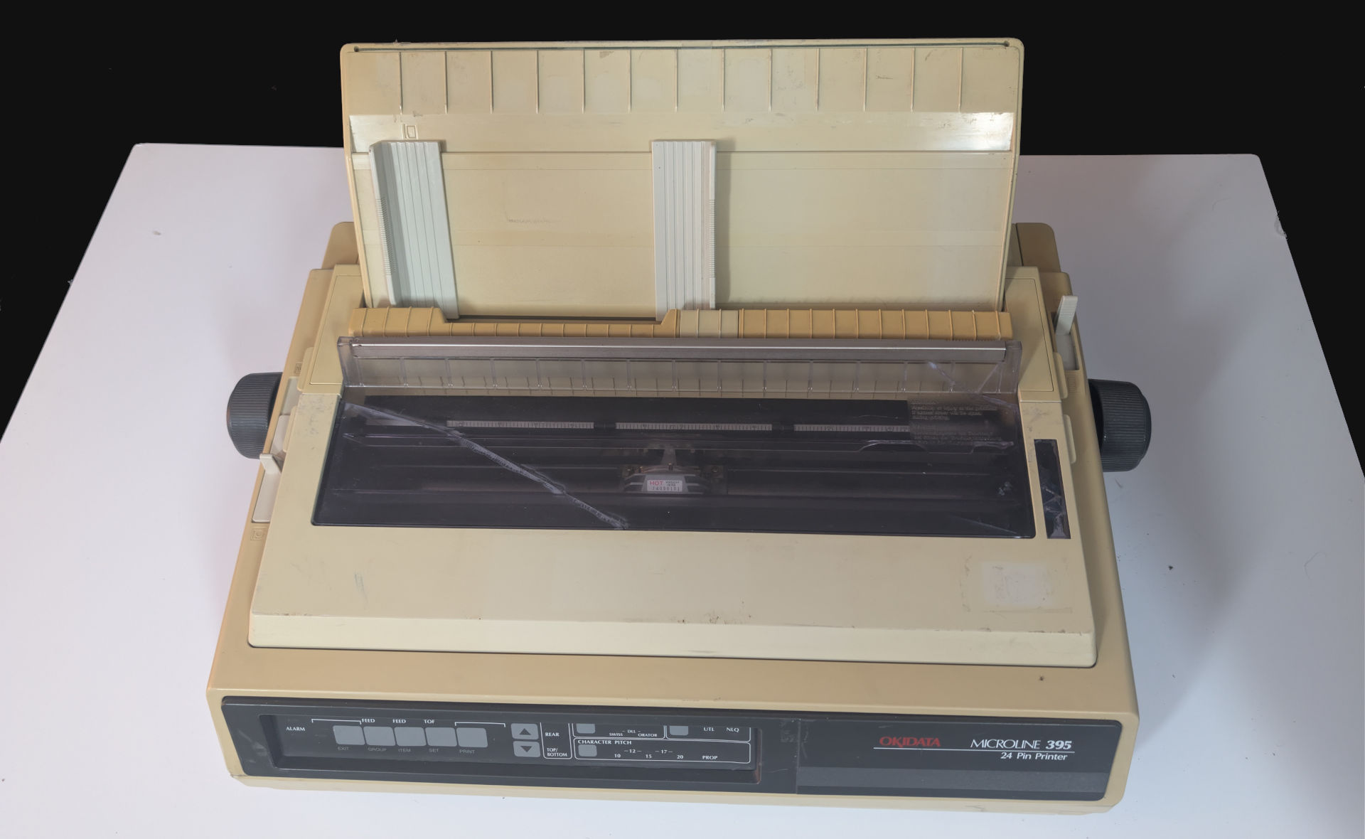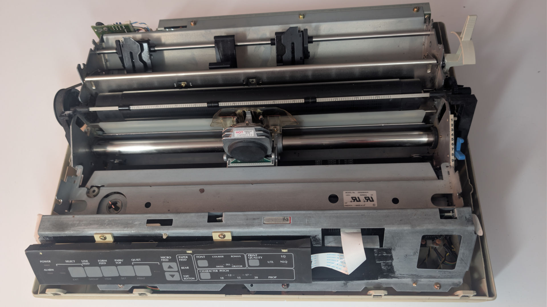 We eventually find this guy on eBay. An Okidata 395. This was the only picture they took, with the control panel facing away. We have no idea of the condition of that. But what we can tell is the metal inside doesn't look rusted to shit. It has all of its plastic despite it desperately needing some retrobrite action. comes with an extra ribbon but missing the roller knob to manually advance the printer (No clue why everyone loses the knob!) With the price at $30(USD)+60(USD)S&H, we'd consider that an acceptable price for a ribbon printer of this age. Ebay vendor did state that he has not tested the unit and thus is selling it for parts/AS-IS. I was fairly stoked on this. Even if there was some electronic failure. Barring a bad system board, we can generally recover from it.