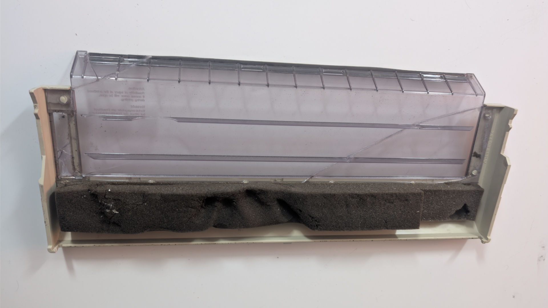 The ribbon door was another part that we had to spend significant time with Gorilla glue putting it all together. But also, the tear-bar exploded off the clear plastic when we got it. And we found out the steel tear bar at the top was held in place using 3M VHB double-sided tape. Which luckily, we had some of that and were able to cut it to size and reapply, allowing the tear-bar to add extra support to all of the broken clear plastics.